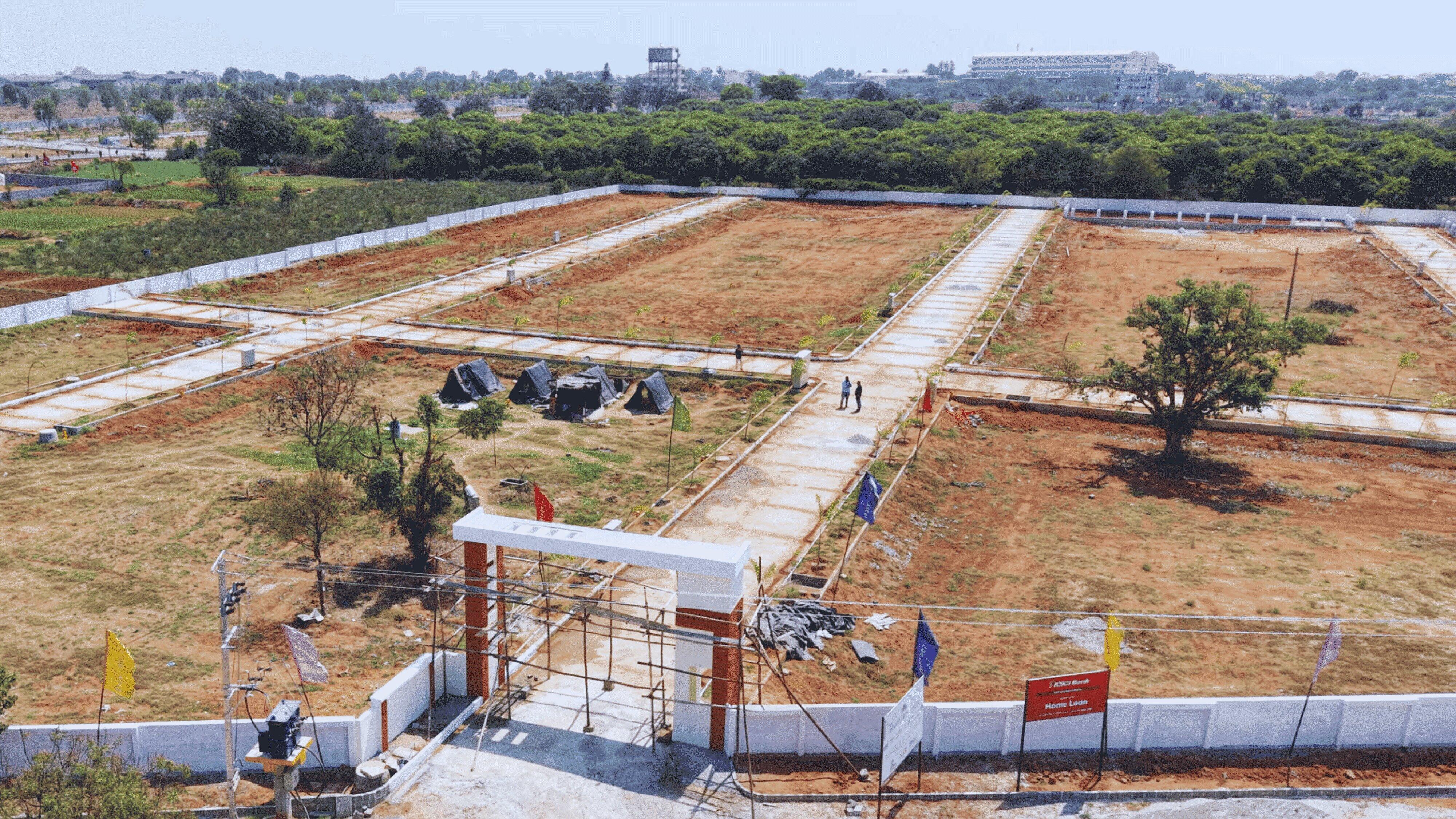 Sanga City Tower is a premium gated community open plots project with blacktop roads, avenue plantation, water connection, and 24/7 security. Located just 15 minutes from Rajiv Gandhi International Airport.